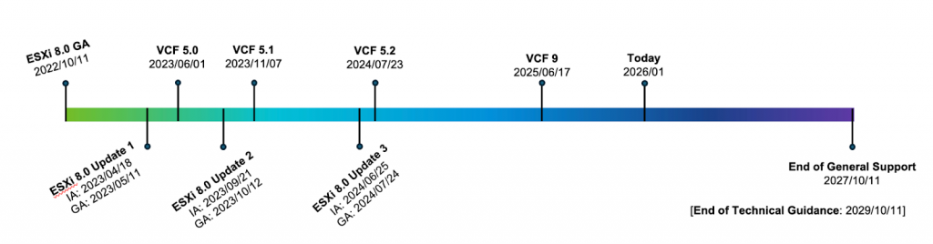 vSphere 8 was released a little over 3 years and 3 months ago. With a 5-year cycle between GA and EOGS (End of General Support), we are already about 65% of the way through. We have just under 35% left—or to put it simply: We have roughly 1 year and 9 months remaining.